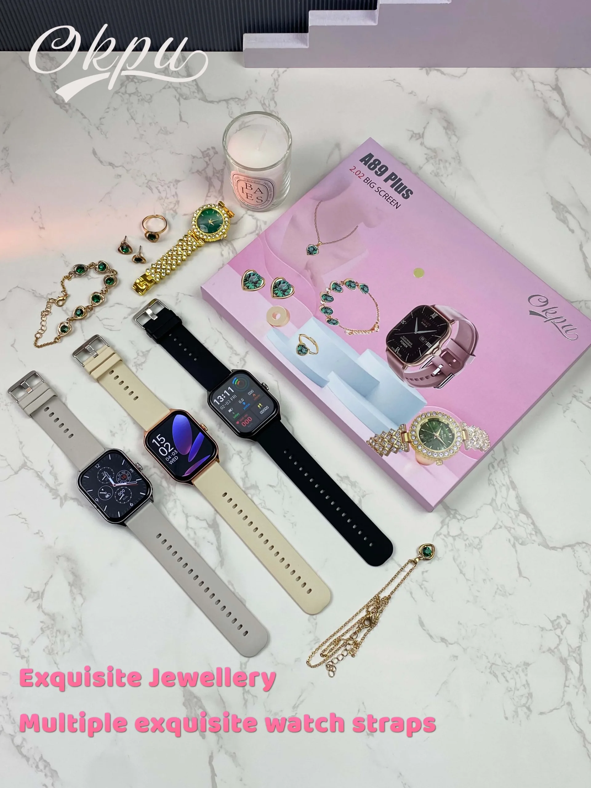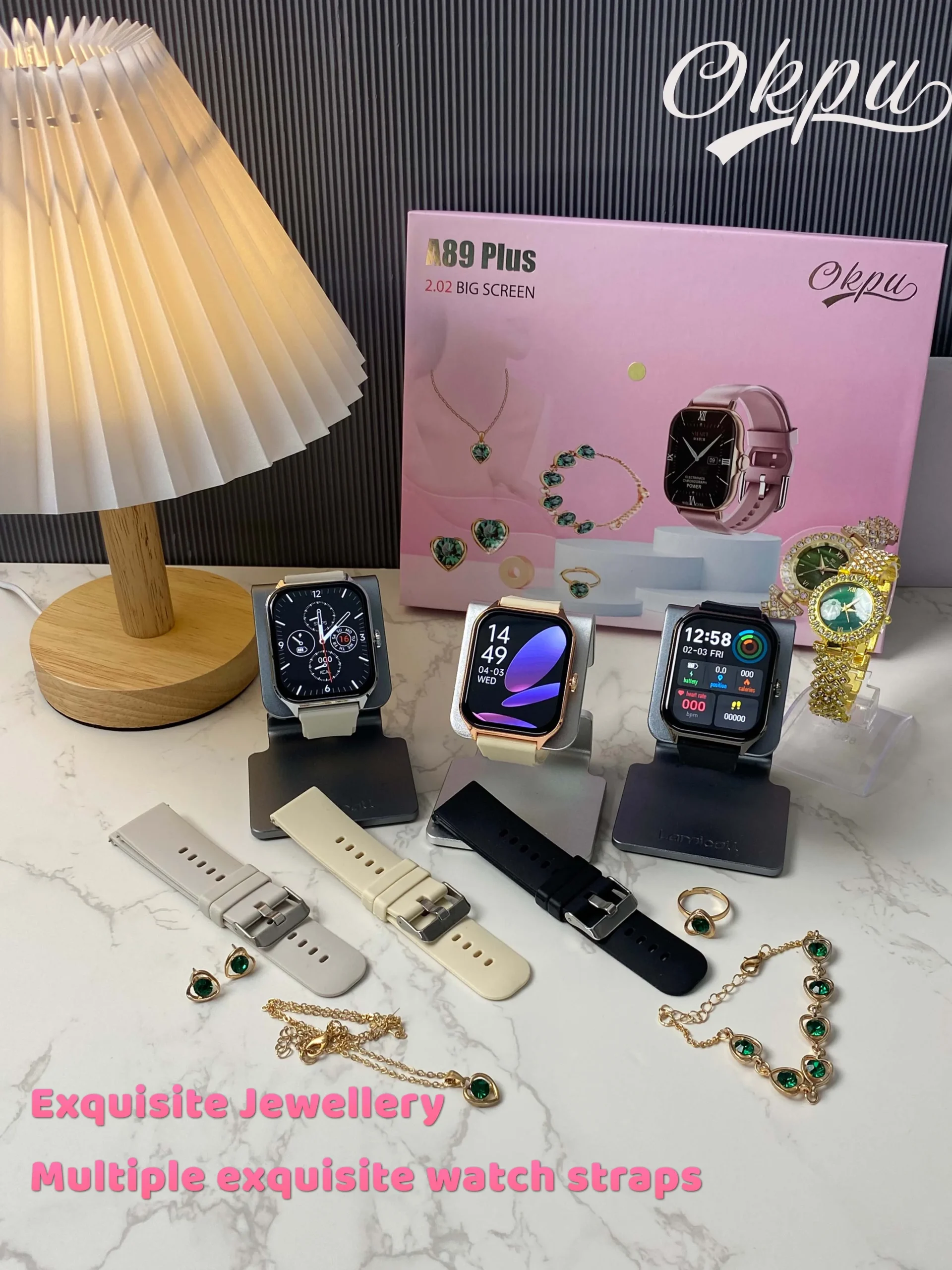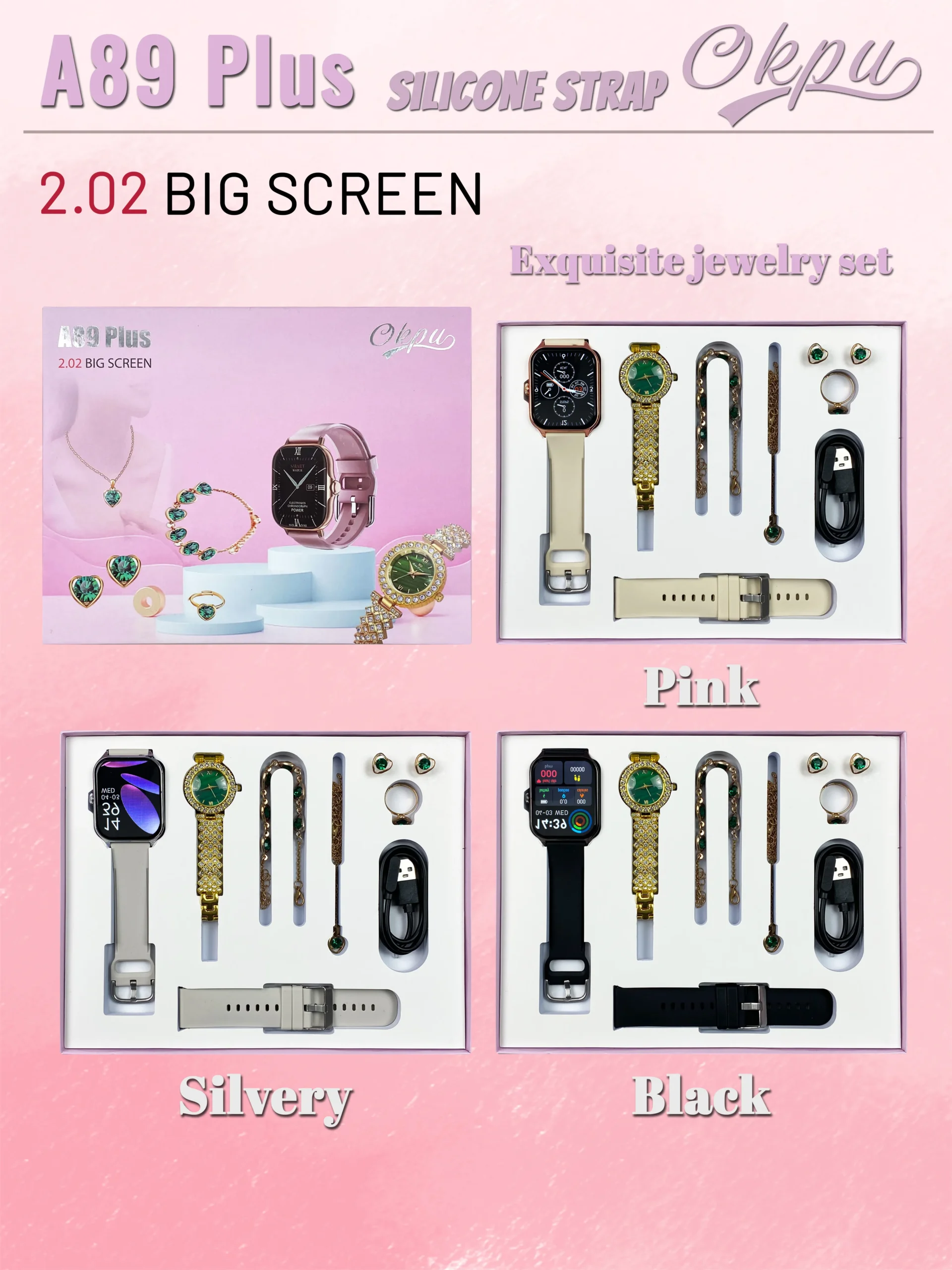 Elevate your style and wellness with the A89 Plus Smartwatch, designed exclusively for women. This 2.02-inch fitness tracker comes with a Necklace, Earrings, Bracelet, and Ring, blending fashion and technology seamlessly. Stay connected, monitor your health, and enjoy smart features with elegance and ease!