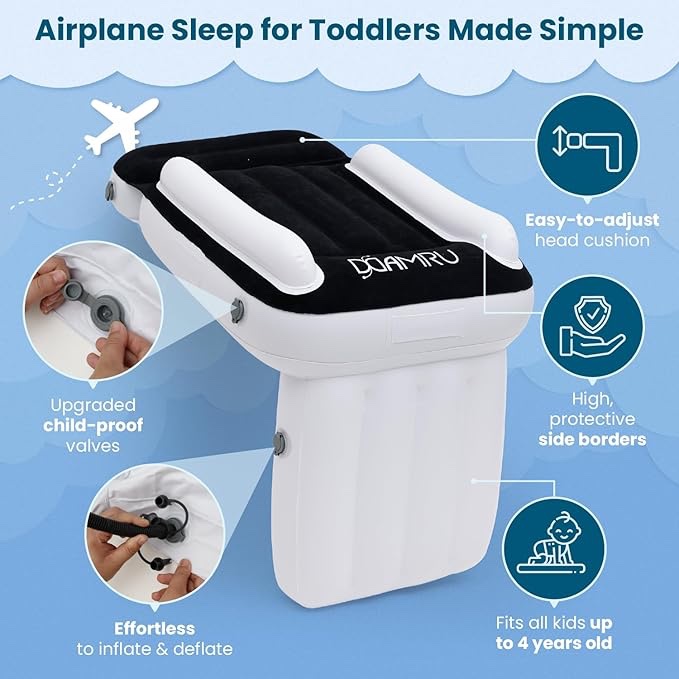 • Smooth Skies Ahead with Our Inflatable kids Bed for airplane: With this inflatable toddler travel bed, your little one will drift off to dreamland, even at 30,000 feet; It turns any airplane seat into a cozy place for them to rest, which will bring peaceful travels for the whole family