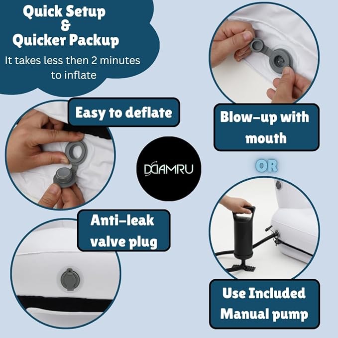 • 2 in 1 Blowup with mouth or pump: Our inflatable airplane bed for kids offers hassle-free inflation during your flight, Blowup with mouth in 2 minutes or use the included whisper-quiet manual pump that takes less than two minutes to fully inflate the airbed.